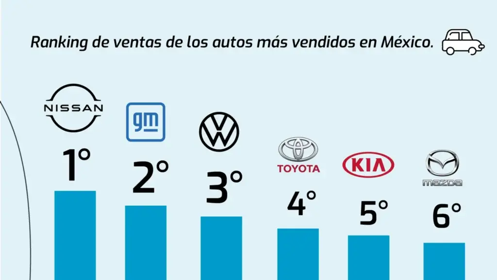 En términos de marcas, el ranking de ventas de los autos más vendidos en México posiciona a Nissan y General Motors en el primer y segundo lugar, respectivamente. Volkswagen y Toyota se encuentran en el tercero y cuarto, seguidos por KIA y Mazda, en el quinto y sexto.